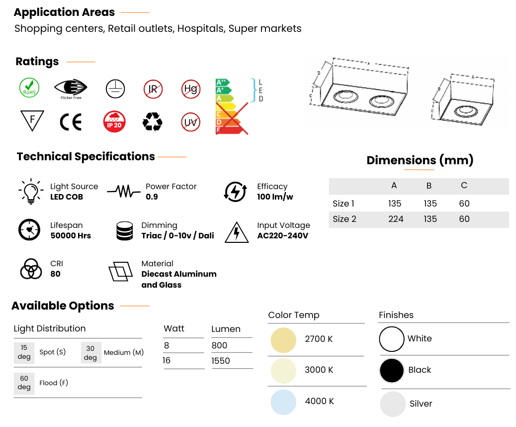 Grid gyro design downlight collection in clean finishes offers multiple options to chose from wattages between 8W – 12W in all standard symmetric beam options and as made available across 2 varied size options to adopt to site requirements within the standard color spectrum.