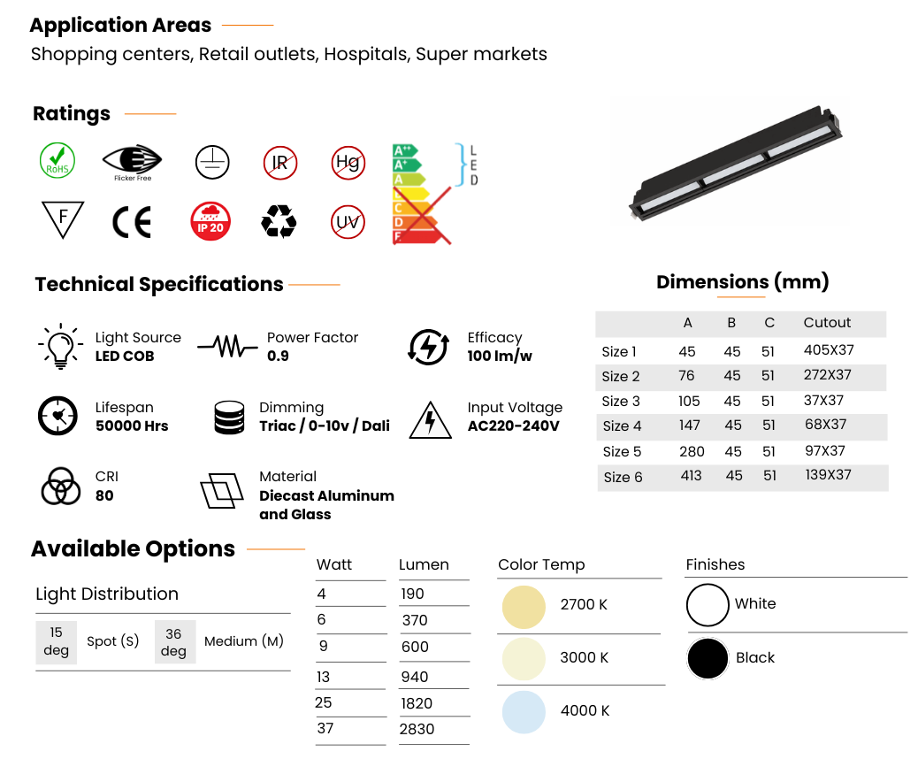 Line linear downlight collection in clean finishes offers multiple options to chose from wattages between 4W – 37W in Spot & Medium beam options and as made available across multiple arrangements to adopt to site requirements within the standard color spectrum.